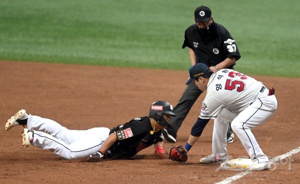 18일 서울 고척스카돔에서 ‘2021 신한은행 SOL KBO리그’ 한국시리즈 4차전 KT위즈와 두산 베어스의 중립 경기가 열렸다. 5회초 2사 1,2루 KT 강백호가 포수 견제 아웃되고 있다.