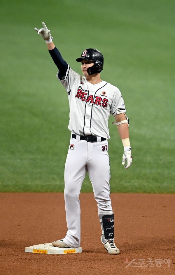 18일 서울 고척스카돔에서 ‘2021 신한은행 SOL KBO리그’ 한국시리즈 4차전 KT위즈와 두산 베어스의 중립 경기가 열렸다. 4회말 무사 두산 박건우가 좌전 2루타를 치고 2루에서 기뻐하고 있다.