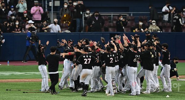 18일 서울 고척스카이돔에서 열린 ‘2021 신한은행 SOL KBO리그’ 포스트시즌 한국시리즈 4차전 두산 베어스와 KT 위즈의 경기에서 KT가 두산에 8-4로 승리를 거두며 한국시리즈 우승을 확정짓고 선수들이 기쁨을 나누고 있다.