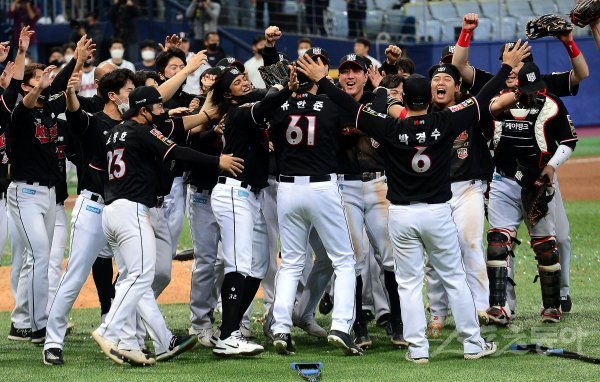 18일 서울 고척스카이돔에서 ‘2021 신한은행 SOL KBO리그’ KT 위즈와 두산 베어스의 한국시리즈 4차전 경기가 열렸다. KT가 두산을 꺾고 창단 첫 통합 우승을 차지한 뒤 선수들이 그라운드에서 기쁨을 나누고 있다.