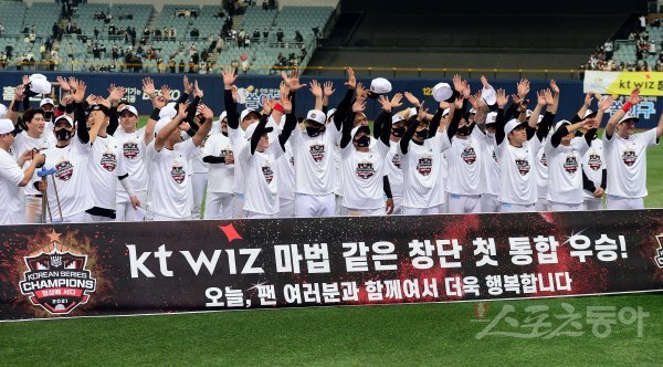 18일 서울 고척스카이돔에서 ‘2021 신한은행 SOL KBO리그’ KT 위즈와 두산 베어스의 한국시리즈 4차전 경기가 열렸다. KT가 두산을 꺾고 창단 첫 통합 우승을 차지한 뒤 선수들이 팬들에게 인사를 하고 있다.