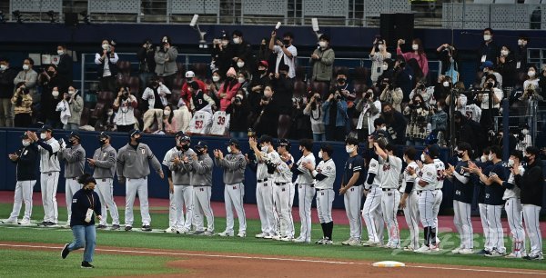 18일 서울 고척스카이돔에서 열린 ‘2021 신한은행 SOL KBO리그’ 포스트시즌 한국시리즈 4차전 두산 베어스와 KT 위즈의 경기에서 두산이 KT에 4-8로 패하며 준우승에 머문 뒤 선수들이 KT 선수들을 향해 손뼉을 치고 있다.