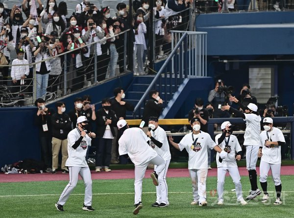 18일 서울 고척스카이돔에서 열린 ‘2021 신한은행 SOL KBO리그’ 포스트시즌 한국시리즈 4차전 두산 베어스와 KT 위즈의 경기에서 KT가 한국시리즈 우승을 확정짓고 선수들이 응원단과 함께 세리머니를 하고 있다.