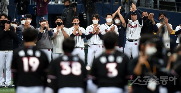 18일 서울 고척스카이돔에서 ‘2021 신한은행 SOL KBO리그’ KT 위즈와 두산 베어스의 한국시리즈 4차전 경기가 열렸다. 준우승을 차지한 두산 선수들이 우승한 KT 선수들을 격려하고 있다.