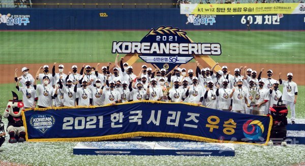 18일 서울 고척스카돔에서 ‘2021 신한은행 SOL KBO리그’ 한국시리즈 4차전 KT위즈와 두산 베어스의 중립 경기가 열렸다. 8-4 승리를 거두며 KT가 시리즈 전적 4승 무패로 우승을 확정지었다.