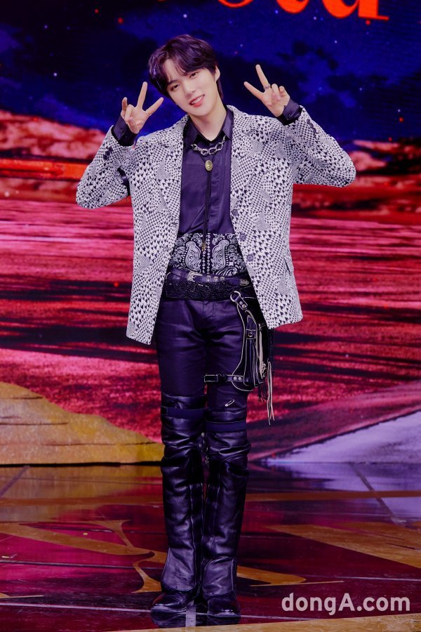 19일 진행된 그룹 몬스타엑스(MONSTA X)의 새 미니앨범 [No Limit(노 리밋)] 발매 기념 온라인 쇼케이스에서 멤버 민혁이 포즈를 취하고 있다.