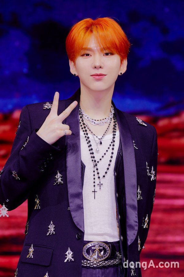 19일 진행된 그룹 몬스타엑스(MONSTA X)의 새 미니앨범 [No Limit(노 리밋)] 발매 기념 온라인 쇼케이스에서 멤버 기현이 포즈를 취하고 있다.