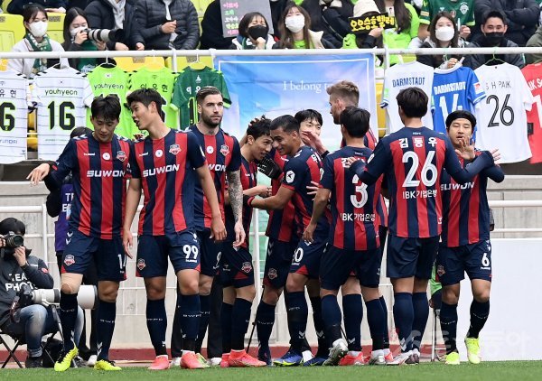 21일 수원 월드컵경기장에서 열린 ‘하나원큐 K리그1 2021’ 수원FC와 전북 현대의 경기에서 수원FC 이영재가 페널티킥을 성공시킨 뒤 동료들과 기쁨을 나누고 있다.