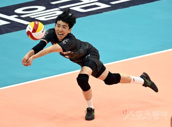 21일 의정부체육관에서 열린 ‘2021~2022 도드람 V-리그’ 남자부 KB손해보험과 한국전력 경기에서 한국전력 오재성이 몸을 날려 리시브하고 있다.