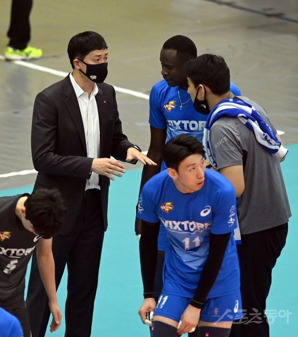 21일 의정부체육관에서 열린 ‘2021~2022 도드람 V-리그’ 남자부 KB손해보험과 한국전력 경기에서 한국전력 장병철 감독이 다우디에게 작전 지시를 하고 있다.