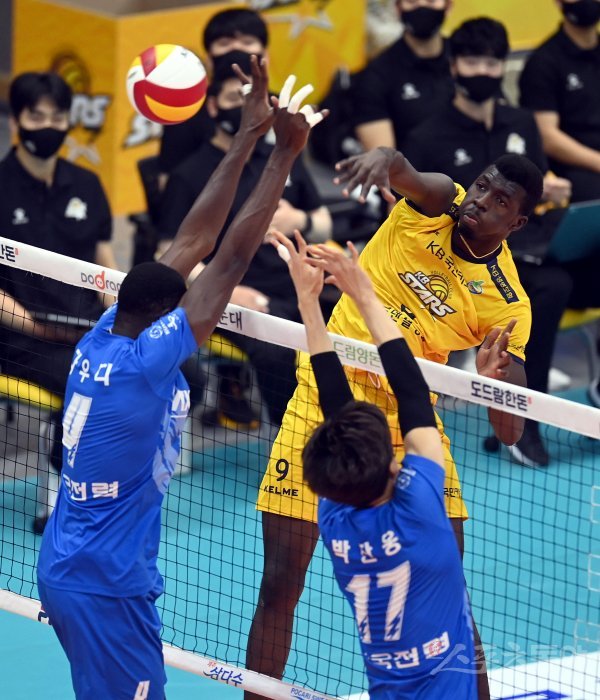 21일 의정부체육관에서 열린 ‘2021~2022 도드람 V-리그’ 남자부 KB손해보험과 한국전력 경기에서 KB손해보험 케이타가 한국전력의 블로킹 사이로 스파이크를 날리고 있다.