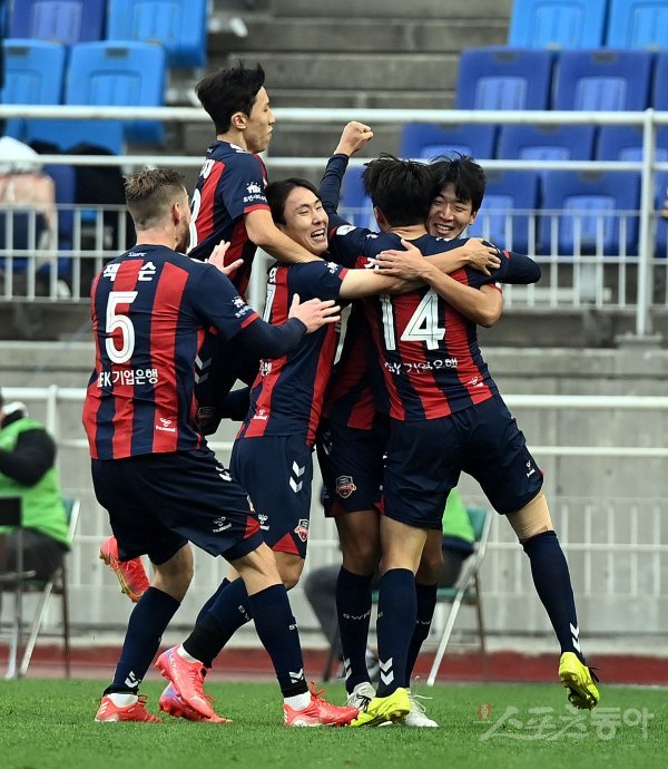 21일 수원 월드컵경기장에서 열린 ‘하나원큐 K리그1 2021’ 수원FC와 전북 현대의 경기에서 수원FC 정재용(오른쪽)이 골을 넣은 뒤 동료들과 기쁨을 나누고 있다.
