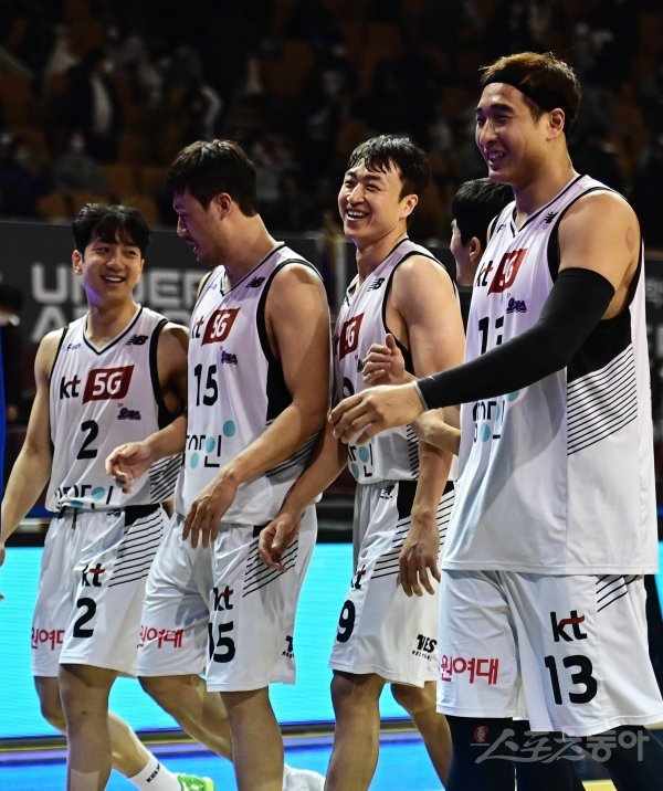 21일 서울 잠실실내체육관에서 열린 ‘2021-2022 KGC 인삼공사 정관장 프로농구’ 서울 삼성과 수원 KT의 경기에서 KT가 삼성에 67-58로 승리를 거둔 뒤 허훈, 김영환, 김현민이 기뻐하고 있다.