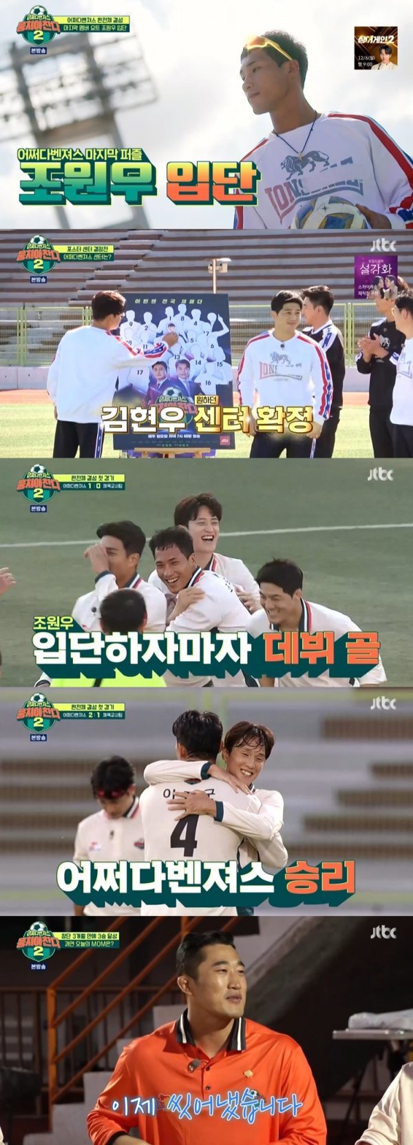 어제(21일) JTBC ‘뭉쳐야 찬다 시즌2’에서는 줄곧 안정환 감독이 러브콜을 보냈던 요트 국가대표 조원우의 입단이 확정되면서 마침내 ‘어쩌다벤져스’가 완성됐다. 주장 이형택이 부재한 위기 상황 속에서도 전설들은 2대 1로 값진 세 번째 승전보를 기록했다.
