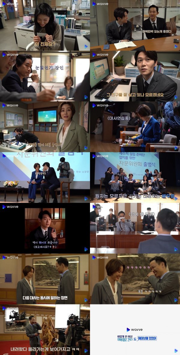 김성령의 연설 장면을 지켜보던 이학주는 “너무 행복하게 촬영하고 있고, 저만 열심히 하면 될 것 같습니다”라며 화기애애한 촬영장 분위기를 과시하기도. 그뿐만 아니라 “웨이브 최곱니다”라고 덧붙이며 틈새 어필도 잊지 않는 재치 있는 모습으로 시청자들을 절로 미소 짓게 한다.