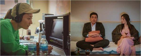 머리카락을 바짝 밀고 “잘하고 싶다”는 의지로 영화 ‘장르만 로맨스’ 촬영현장을 연출자로서 지휘한 조은지 감독(왼쪽 사진)과 영화 ‘장르만 로맨스’의 한 장면. 사진제공|NEW
