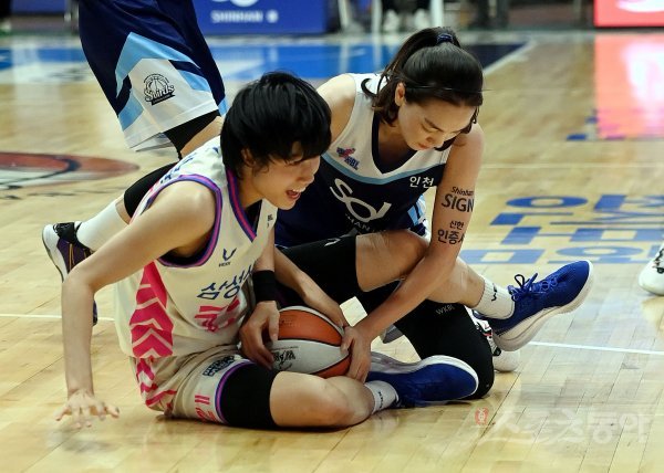 22일 인천 도원체육관에서 열린 ‘삼성생명 2021-2022 여자프로농구’ 인천 신한은행과 용인 삼성생명의 경기에서 삼성생명 이해란과 신한은행 한채진이 볼 다툼을 벌이고 있다.