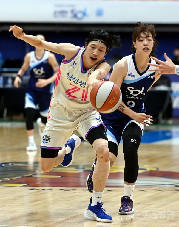 22일 인천 도원체육관에서 열린 ‘삼성생명 2021-2022 여자프로농구’ 인천 신한은행과 용인 삼성생명의 경기에서 삼성생명 이해란이 신한은행 이경은과 볼 다툼을 벌이고 있다.