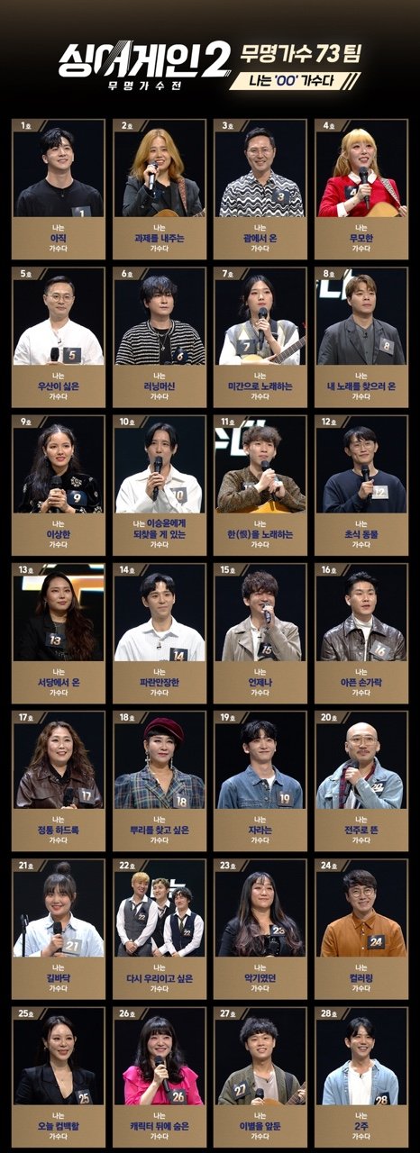 JTBC ‘싱어게인 시즌2-무명가수전’(약칭 ‘싱어게인2’) 제작진은 24일 공식 홈페이지를 통해 본선 진출 73팀의 얼굴을 최초로 공개했다.