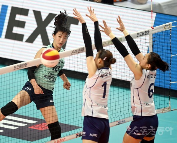 24일 서울 장충체육관에서 열린 ‘2021~2022 도드람 V-리그’ 여자부 GS칼텍스와 한국도로공사 경기에서 GS칼텍스 강소휘가 한국도로공사의 블로킹 사이로 스파이크를 날리고 있다.