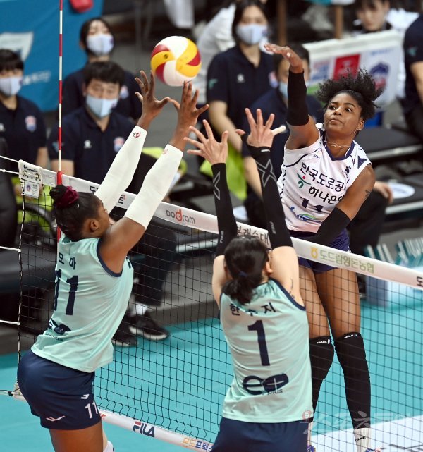 24일 서울 장충체육관에서 열린 ‘2021~2022 도드람 V-리그’ 여자부 GS칼텍스와 한국도로공사 경기에서 한국도로공사 켈시가 GS칼텍스의 블로킹 사이로 스파이크를 날리고 있다.