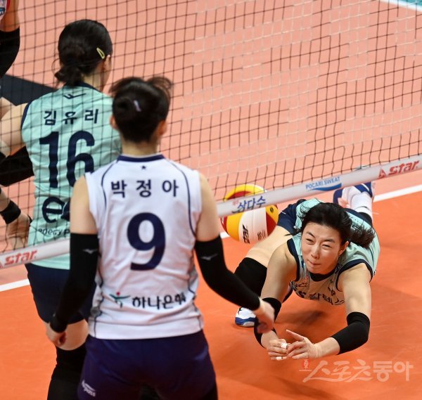 24일 서울 장충체육관에서 열린 ‘2021~2022 도드람 V-리그’ 여자부 GS칼텍스와 한국도로공사 경기에서 GS칼텍스 강소휘가 몸을 날려 리시브하고 있다.