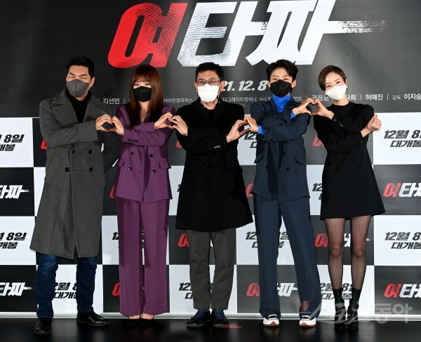 25일 오전 서울 롯데시네마 건대입구에서 열린 영화 ‘여타짜’ 언론 배급 시사회 및 간담회 참석한 최민철, 이채영, 이지승 감독, 정혜인, 김사희가 포즈를 취하고 있다.