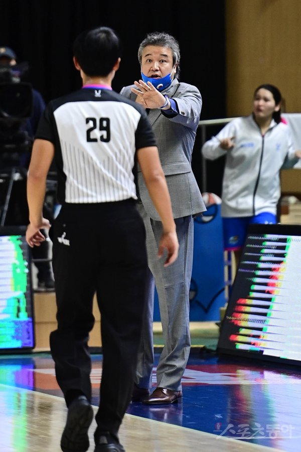 25일 경기도 용인실내체육관에서 열린 ‘삼성생명 2021-2022 여자프로농구’ 용인 삼성생명과 부천 하나원큐의 경기에서 삼성생명 임근배 감독이 심판의 반칙 선언에 어필하고 있다.