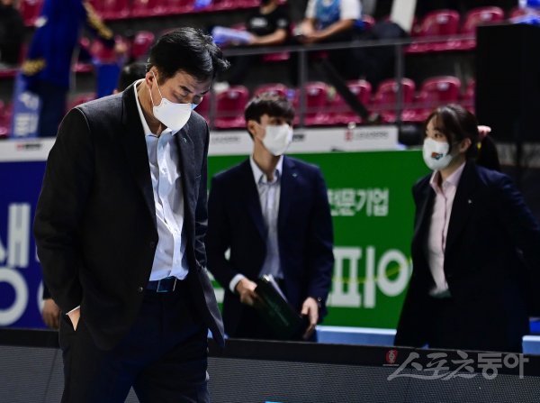 25일 경기도 용인실내체육관에서 열린 ‘삼성생명 2021-2022 여자프로농구’ 용인 삼성생명과 부천 하나원큐의 경기에서 하나원큐 이훈재 감독이 고개를 숙이고 있다.