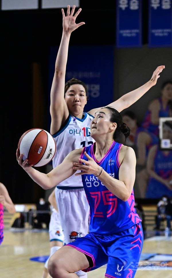 25일 경기도 용인실내체육관에서 열린 ‘삼성생명 2021-2022 여자프로농구’ 용인 삼성생명과 부천 하나원큐의 경기에서 삼성생명 배혜윤이 하나원큐 양인영의 수비를 뚫고 슛을 쏘고 있다.