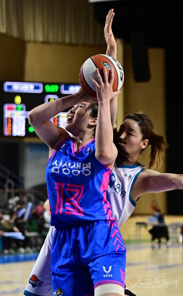 25일 경기도 용인실내체육관에서 열린 ‘삼성생명 2021-2022 여자프로농구’ 용인 삼성생명과 부천 하나원큐의 경기에서 삼성생명 김단비가 슛을 쏘고 있다.