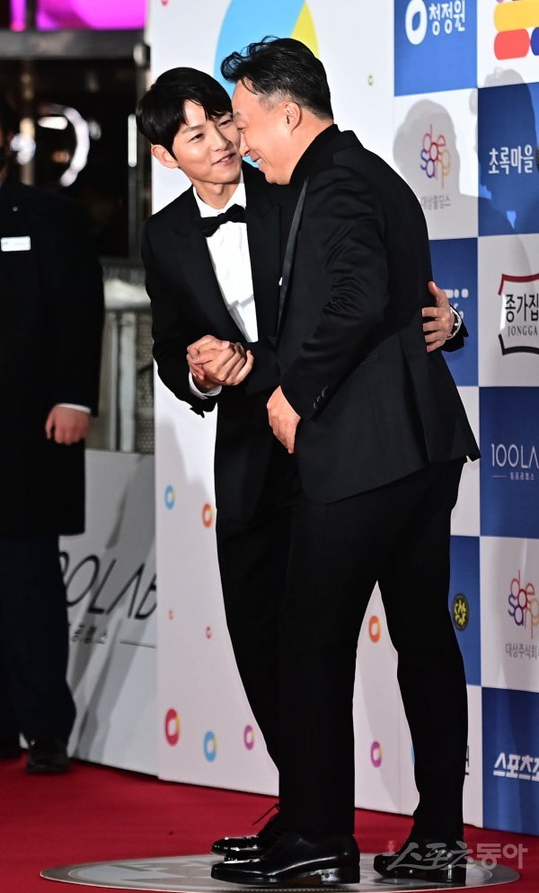 배우 송중기와 이성민이 26일 서울 영등포구 여의도 KBS홀에서 열린 ‘제42회 청룡영화상’ 포토월에서 인사하고 있다.