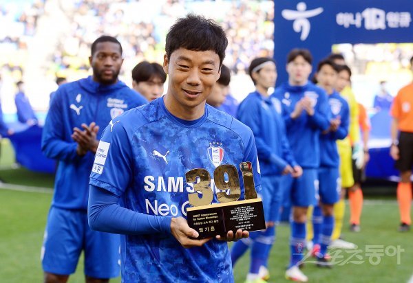 28일 경기도 수원 월드컵경기장에서 열린 ‘하나원큐 K리그1 2021’ 수원 삼성과 울산 현대의 경기에서 수원 염기훈이 391경기 출장 기념패를 받은 후 포즈를 취하고 있다.