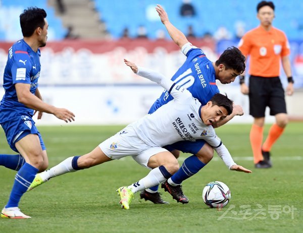 28일 경기도 수원 월드컵경기장에서 열린 ‘하나원큐 K리그1 2021’ 수원 삼성과 울산 현대의 경기에서 울산 이동준이 상대 수비수와 몸싸움을 벌이다 넘어지고 있다.