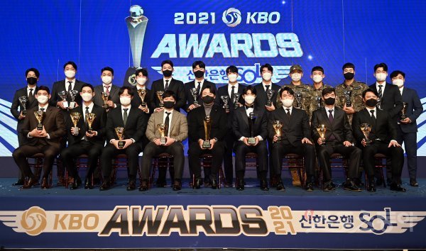 29일 서울 논현동 임피리얼 팰리스 서울호텔에서 열린 ‘2021 KBO 시상식’에 참석한 부문별 수상자들이 기념촬영을 하고 있다.