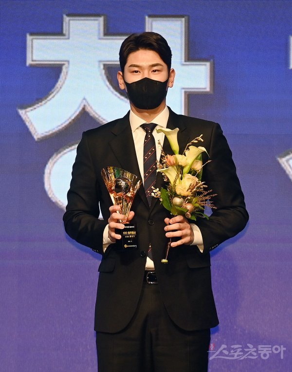 29일 서울 논현동 임피리얼 팰리스 서울호텔에서 열린 ‘2021 KBO 시상식’에 참석한 LG 홍창기가 출루율상을 수상한 뒤 기념촬영을 하고 있다.