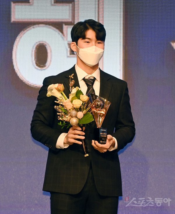 29일 서울 논현동 임피리얼 팰리스 서울호텔에서 열린 ‘2021 KBO 시상식’에 참석한 키움 김혜성이 도루상을 수상한 뒤 기념촬영을 하고 있다.