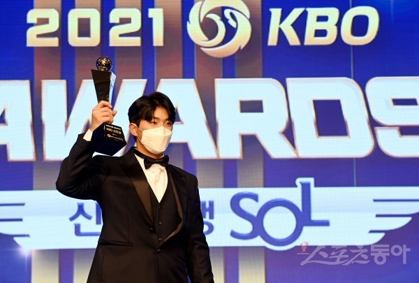 29일 서울 논현동 임피리얼 팰리스 서울호텔에서 열린 ‘2021 KBO 시상식‘에 참석한 KIA 이의리가 신인상을 수상한 뒤 포즈를 취하고 있다. 김민성 기자 marineboy@donga.com