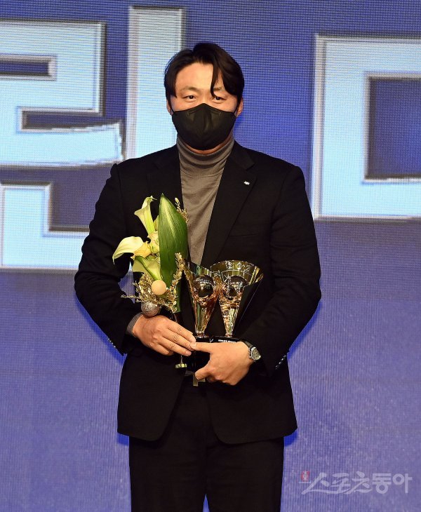 29일 서울 논현동 임피리얼 팰리스 서울호텔에서 열린 ‘2021 KBO 시상식’에 참석한 두산 미란다(대리수상 배영수 코치)가 평균자책점상, 탈삼진상을 수상한 뒤 기념촬영을 하고 있다.