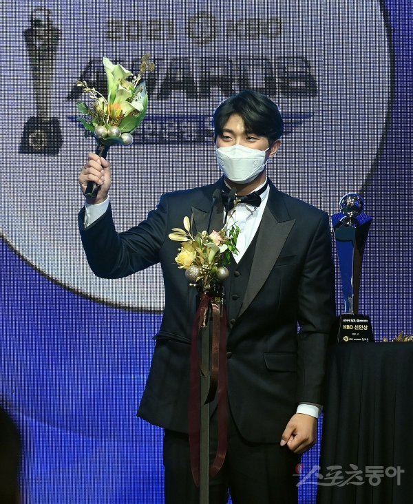29일 서울 논현동 임피리얼 팰리스 서울호텔에서 열린 ‘2021 KBO 시상식’에 참석한 KIA 이의리가 신인상을 수상한 뒤 수상 소감을 밝히고 있다.