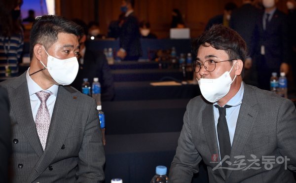 29일 서울 논현동 임피리얼 팰리스 서울호텔에서 열린 ‘2021 KBO 시상식’에 참석한 이숭용 kt 단장과 장정석 KIA 신임단장이 이야기를 나누고 있다.