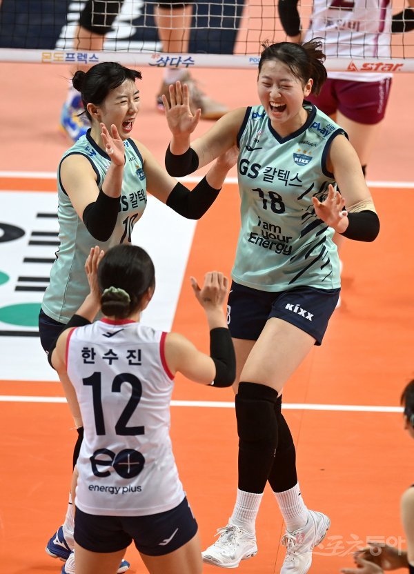 30일 서울 장충체육관에서 열린 ‘2021~2022 도드람 V-리그’ 여자부 GS칼텍스와 KGC인삼공사 경기에서 GS칼텍스 권민지가 블로킹 득점에 성공한 후 기뻐하고 있다.