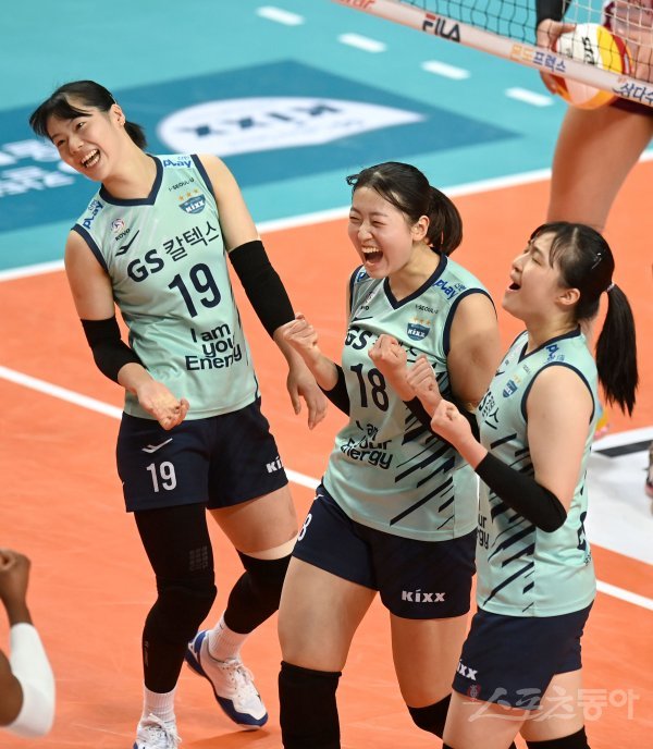 30일 서울 장충체육관에서 열린 ‘2021~2022 도드람 V-리그’ 여자부 GS칼텍스와 KGC인삼공사 경기에서 GS칼텍스 권민지가 블로킹 득점에 성공한 후 기뻐하고 있다.