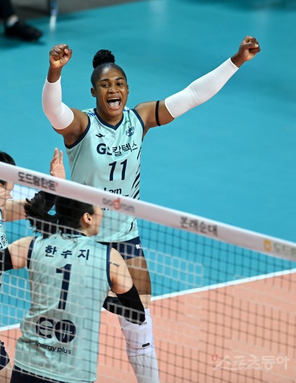 30일 서울 장충체육관에서 열린 ‘2021~2022 도드람 V-리그’ 여자부 GS칼텍스와 KGC인삼공사 경기에서 GS칼텍스 모마가 블로킹 득점에 성공한 후 기뻐하고 있다.