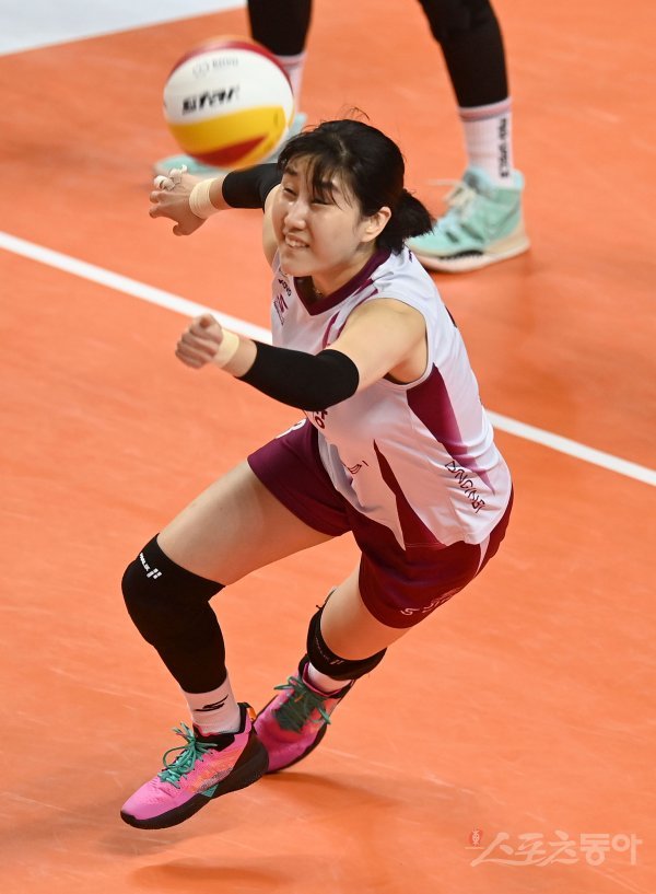 30일 서울 장충체육관에서 열린 ‘2021~2022 도드람 V-리그’ 여자부 GS칼텍스와 KGC인삼공사 경기에서 KGC인삼공사 염혜선이 몰을 날려 리시브하고 있다.
