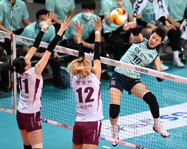 30일 서울 장충체육관에서 열린 ‘2021~2022 도드람 V-리그’ 여자부 GS칼텍스와 KGC인삼공사 경기에서 GS칼텍스 강소휘가 KGC인삼공사의 블로킹 사이로 스파이크를 날리고 있다.