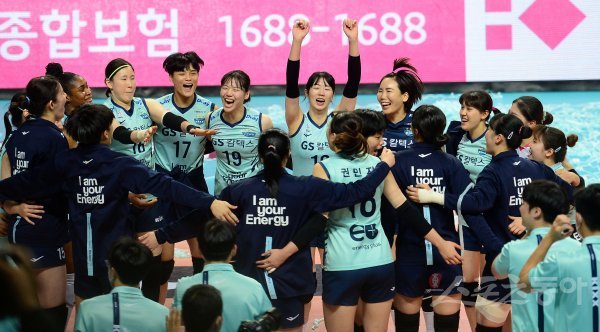 30일 서울 장충체육관에서 열린 30일 서울 장충체육관에서 열린 ‘2021~2022 도드람 V-리그’ 여자부 GS칼텍스와 KGC인삼공사 경기에서 GS칼텍스 선수들이 세트스코어 3-0 완승을 거둔 후 기뻐하고 있다.