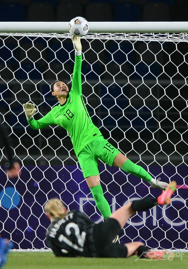 30일 경기도 고양종합운동장에서 열린 ‘신세계 이마트 초청 여자축구국가대표팀 친선경기’ 한국과 뉴질랜드의 경기에서 한국 김정미가 뉴질랜드의 슛을 막고 있다.