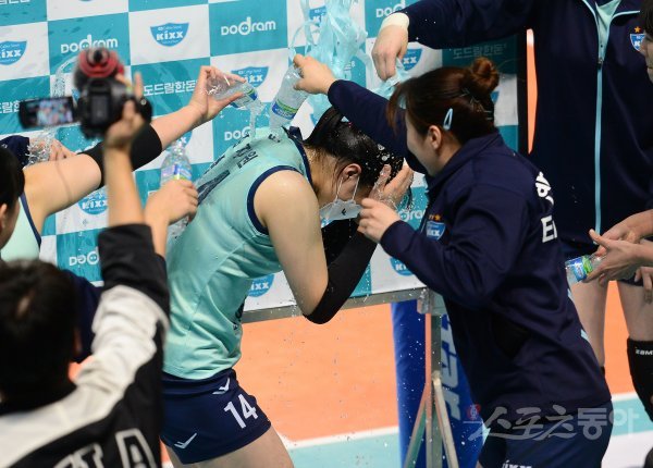 30일 서울 장충체육관에서 열린 30일 서울 장충체육관에서 열린 ‘2021~2022 도드람 V-리그’ 여자부 GS칼텍스와 KGC인삼공사 경기에서 수훈 선수 인터뷰를 마친 GS칼텍스 김지원이 축하를 받고 있다.