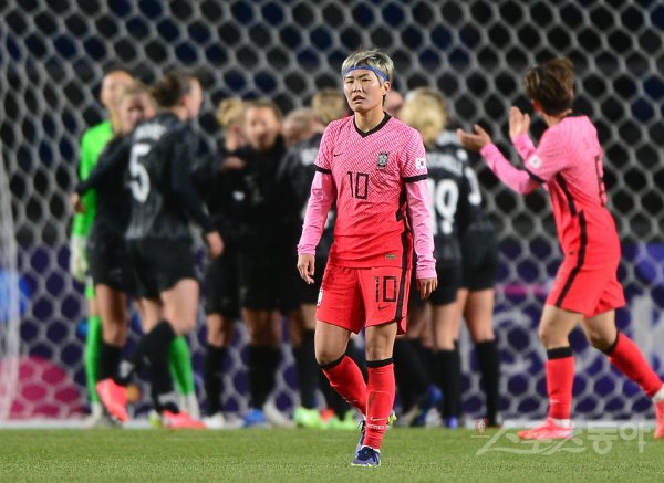 30일 경기도 고양종합운동장에서 열린 ‘신세계 이마트 초청 여자축구국가대표팀 친선경기’ 한국과 뉴질랜드의 경기에서 한국 지소연이 뉴질랜드에 추가골을 허용한 뒤 아쉬워하고 있다.